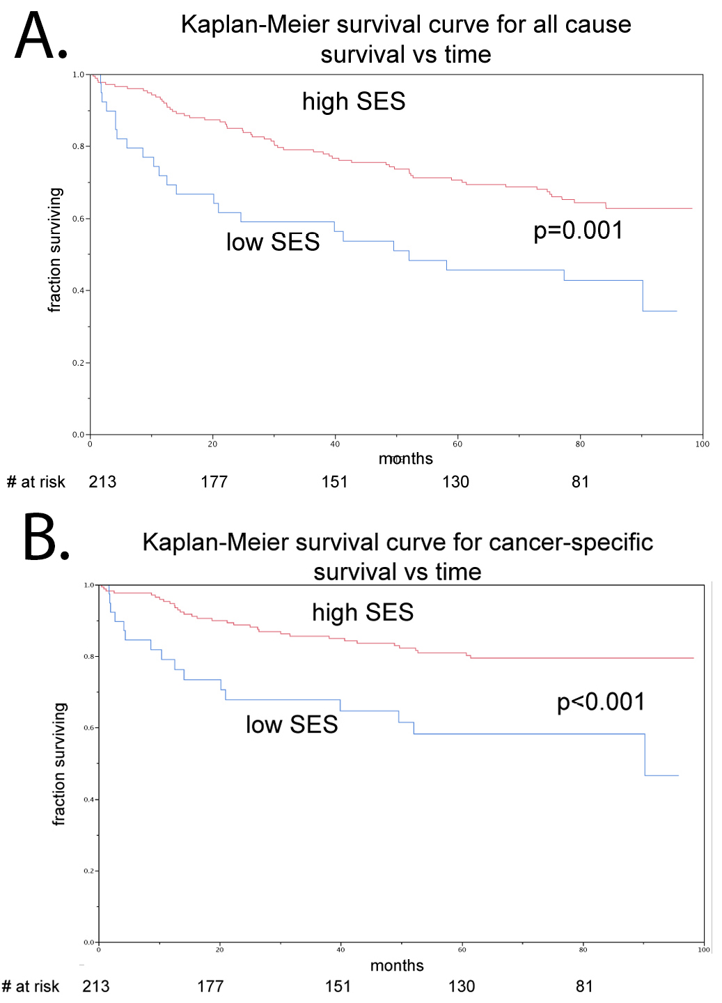 Figure 1. Kaplan-Meier survival curves stratified by socio-economic status. A. All-cause mortality was significantly greater in the low socio-economic group compared to the high socio-economic group (P < 0.001). B. Bladder cancer-specific mortality was significantly greater in the low low-socioeconomic group compared to the high socio-economic group (P < 0.001).