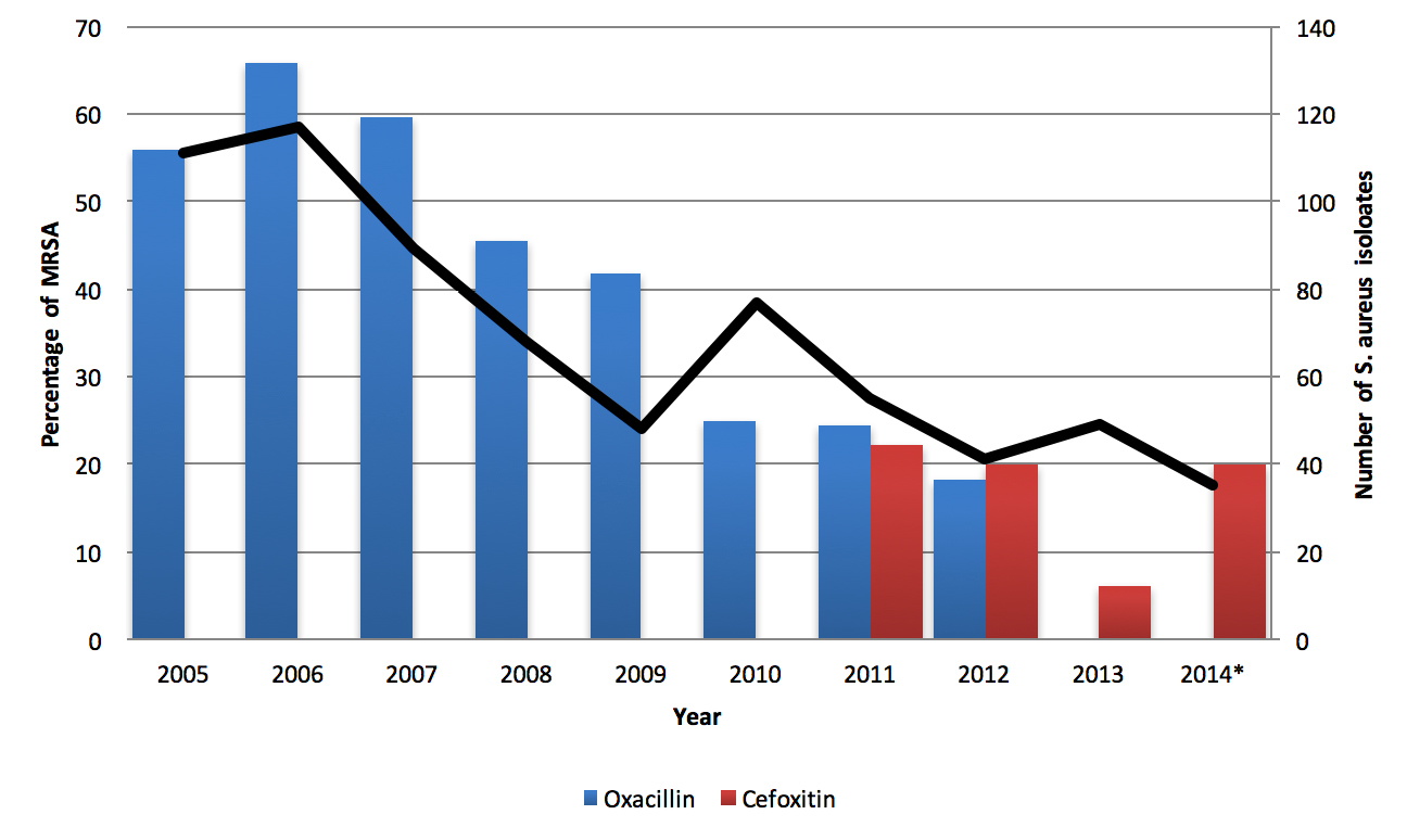 Our primary limitation is the lack of clinical data to correlate with our pathology results, inherently due to the retrospective nature of the study. We were unable to correlate episodes of bacteriuria with concurrent bacteremia, clinical status or symptomatology. However, as infection or invasive disease may arise from earlier urinary tract colonization the susceptibility profile we have reported is still relevant to the management of all these conditions [11]. As our results are, only from a single center they may not reflect the situation at other hospitals. Further, the lack of robust population-based susceptibility data precludes the comparison of our results with the wider population. The laboratory tests for the detection of the MRSA phenotype evolved over the course of our study. Many laboratories in the past decade, including the present study until 2010, relied on oxacillin rather than cefoxitin for the detection of methicillin resistance. The gold standard test for MRSA is detection of the MecA gene by PCR, which was not used in the present study or routinely in hospital microbiology laboratories. Compared to this, the reported sensitivity of cefoxitin is > 99% which is superior to oxacillin which has been reported as 78%–95%. Further, beta-lactamase hyper-production and high NaCl sensitivity results in false positives without clinically significant penicillin resistance when using oxacillin. Ongoing laboratory issues with MRSA detection include the small difference in zone diameter between MSSA and MRSA isolates necessitating precise measurement of the zones [26,27]. It is likely laboratory protocol may account for some regional variations in MRSA prevalence as well as a small part of the decrease in MRSA prevalence we observed.