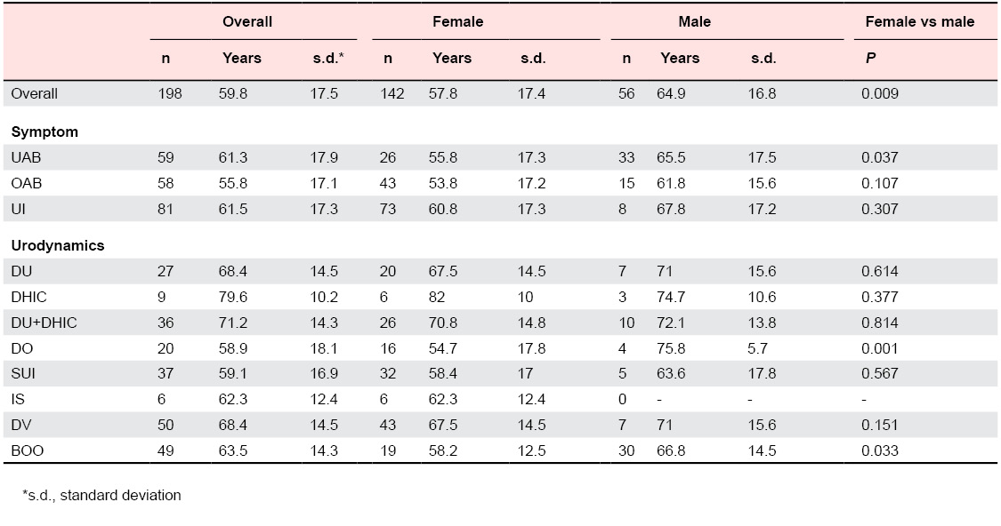 UAB patients do not differ in mean age, whereas DU patients are older than non-DU patients, suggesting that DU may relate to aging whereas UAB is a common term in a limited perceptual vocabulary. Our retrospective categorization of primary symptom into filling, voiding, and incontinence centered categories lacks sufficient resolution to determine if the experience of UAB is shared across age and categories of dysfunction. Given the broad overlaps of the individual data point distributions for all measures, it seems reasonable to expect that UAB might be further phenotyped, allowing subcategorizations which could carry some diagnostic value.