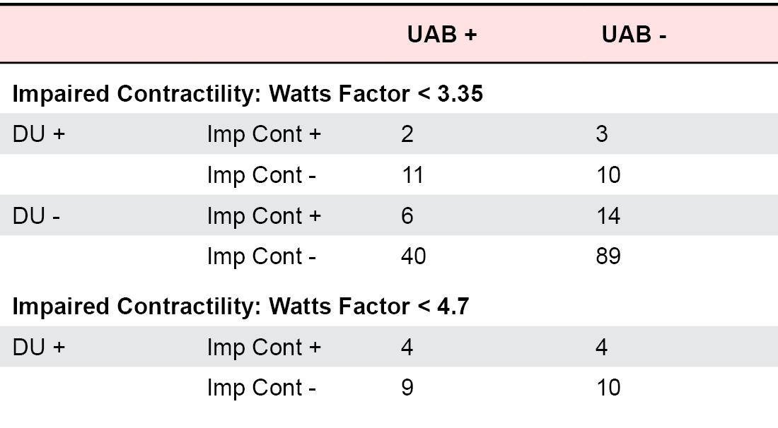 For WF, the 25th percentile value of the non-normally distributed data was 4.70. Following normalization of WF data by logarithmic transformation, the antilog of the log (WF) one standard deviation below the mean was determined, 3.35. Contingency tables created are shown in Table 2. In neither case was a statistically significant relationship between UAB or DU with impaired contractility found.