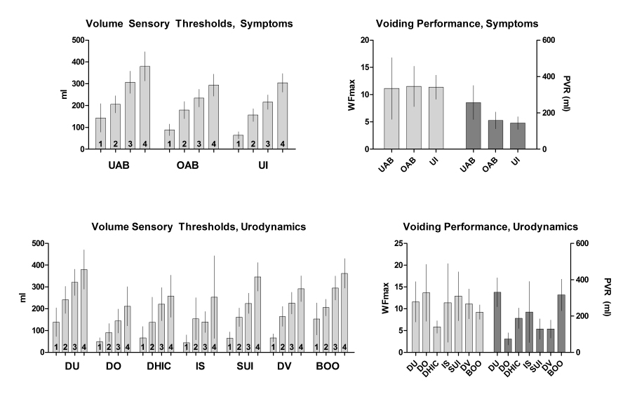 Figure 1. Bladder filling and voiding data for symptom and urodynamic groupings. For volume sensations, 1 = First Sensation, 2 = First Desire, 3 = Normal Desire, 4 = Strong Desire. Means ± +/- 95% CI of the mean.