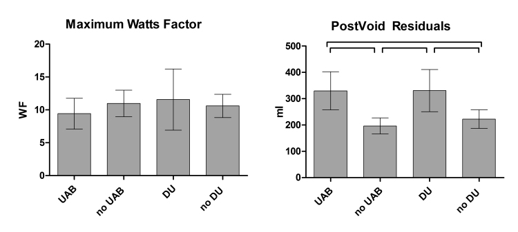 Figure 3. Analysis of voiding performance, maximum WF and post-void residual volume, based on symptoms (UAB +/-) and urodynamics (DU +/-). Means ± 95% CI of the mean. Brackets denote significant differences, P < 0.05 (Kruskal-Wallace test with Dunns post-hoc).