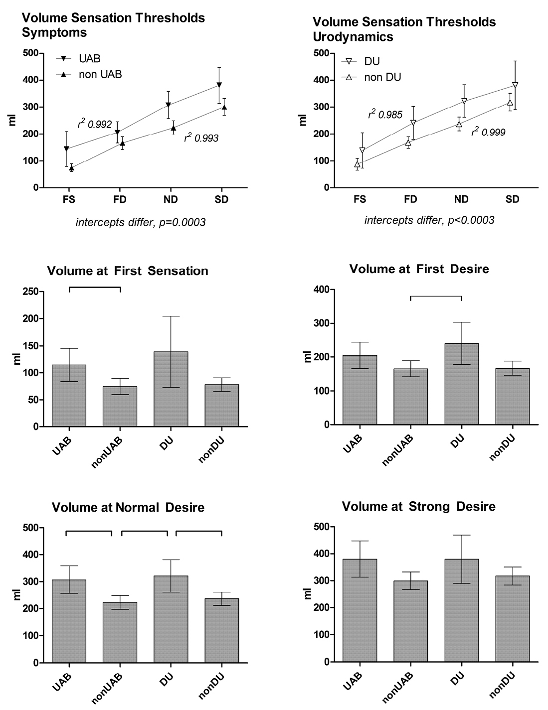 The sensory volume threshold data are shown in Figure 3. The relationship of volume to ordinal sensations for both symptoms and findings proved to be highly linear (coefficients shown in the Figure). For both symptoms and urodynamics the y-intercept of the volume/sensations curve was significantly greater for UAB and DU than the alternate group, but the slopes were similar. UAB patients had greater volumes at FS and ND, whereas only ND was significantly larger for DU than non-DU. UAB did not differ from DU at any threshold, nor did non-UAB from non-DU.