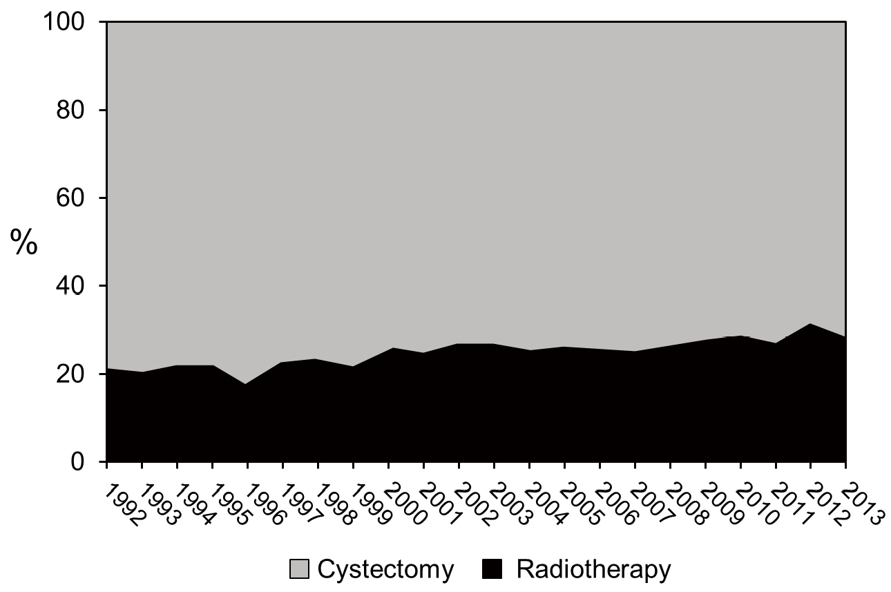 14]. Patients with noninvasive or T1 disease were not included. The SEER program is sponsored by the National Cancer Institute and is comprised of 18 cancer registries. Its database includes population-based cancer incidence, treatment, and survival data covering approximately 28% of the United States population. We selected 1992 as the first year of this study since it is when a number of new registries joined the program, and it allowed for analysis of a sufficient duration of time to assess trends. Patients were eligible for inclusion if they received either RT or cystectomy as initial definitive treatment. Cystectomy was defined as radical or partial. Patients were excluded who had a prior history of non-bladder malignancy or who were younger than age 18 at time of diagnosis. Patients who had initial treatment other than cystectomy or RT, had no treatment, or for whom treatment information was not available were also excluded, leaving 16175 patients for the primary analysis.