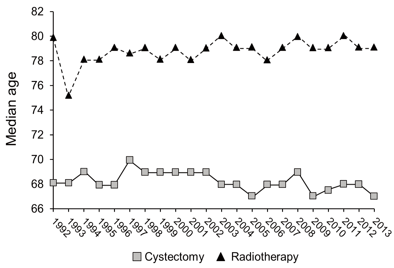 Figure 1 shows the percent utilization of RT for localized MIBC over time compared with cystectomy. While cystectomy was utilized more frequently than RT throughout the study period, there was a statistically significant increase in the proportion of patients receiving RT (24% in 1992–2002 vs. 28% in 2003–2013, P < 0.01) over time. This increase occurred in the context of no change in median patient age (71 for each 1992–2002 and 2003–2013, P = 0.41). The median patient age by treatment group over the study period is shown in Figure 2. Over the study period, the number of patients treated with either modality increased from 1.66 per 100000 person-years in 1992 to 3.24 per 100000 person-years in 2013; the yearly average for the cohort (1992–2013) was 2.70 per 100000 person-years.