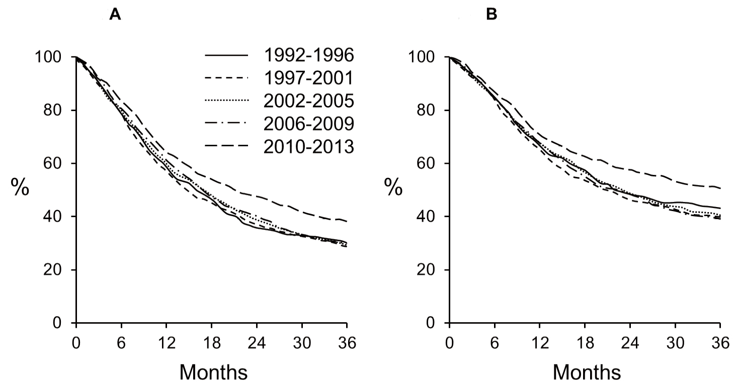 Figure 3. Three-year OS (A) and CSS (B) of patients receiving RT for bladder cancer stratified by year of diagnosis.