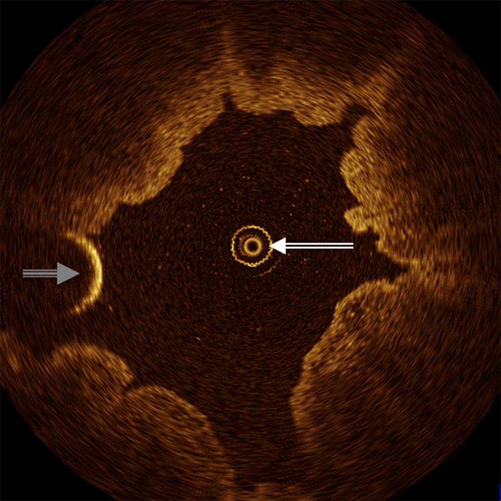 Figure 1. Axial, cross-sectional OCT image of human upper ureter in vivo demonstrates OCT probe (double-lined white arrow) in the center and wire guide of ureterorenoscope (triple-lined grey arrow) on the side of the ureter lumen.