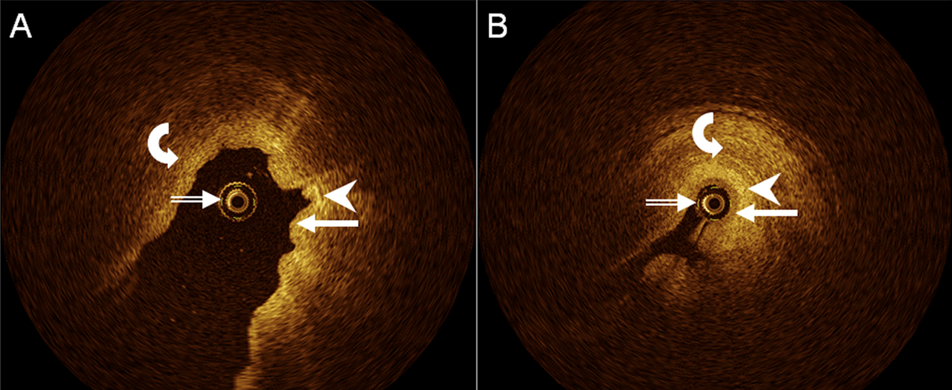 Figure 2. Axial, cross-sectional OCT images of human upper ureter in vivo, A, with fluid distending the ureter lumen, and B, with little fluid within the ureter lumen, demonstrate OCT probe (double-lined white arrows), urothelium (arrows), lamina propria (arrowheads), and muscle layer (curved arrows). Distinct layering of ureter wall appears to be better appreciated in (B).