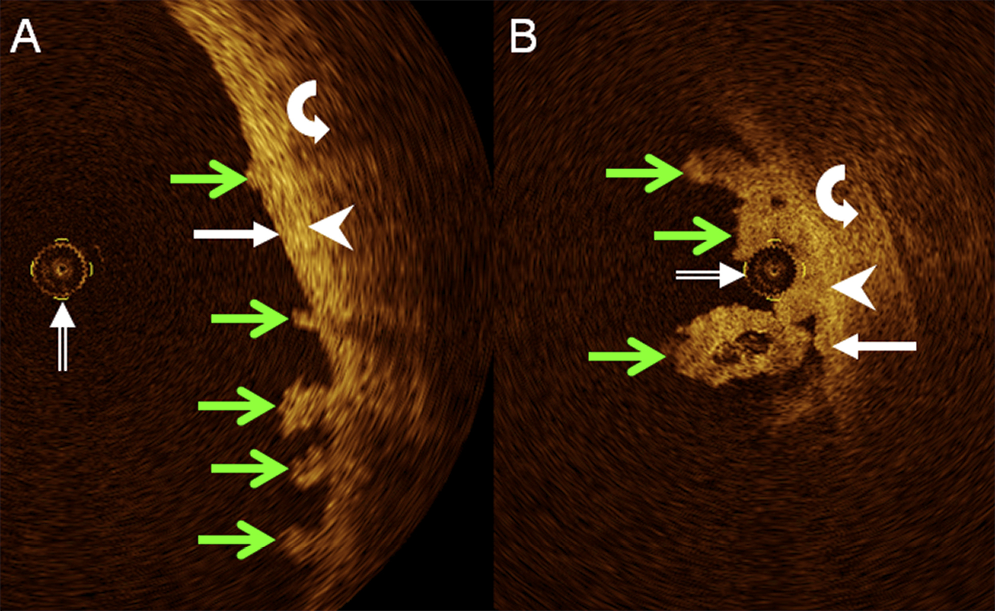 Figure 4. Details from axial, cross-sectional OCT images of human ureter in vivo in two different patients demonstrate superficial papillary-exophytic urothelial carcinoma (green arrows in A and B) remote from (A) or adjacent to (B) OCT probe (double-lined white arrow). Respective delineation of urothelium (white arrows), lamina propria (white arrowheads), and muscle layer (curved white arrows) remains undisturbed.