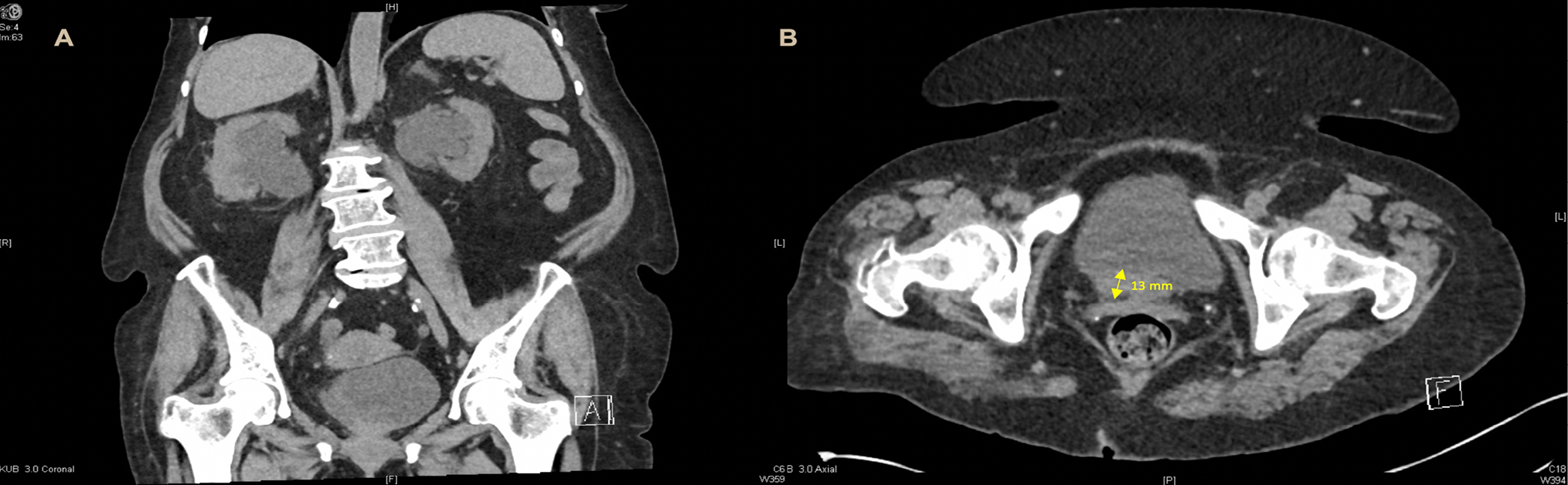 Figure 1. Computed tomography—coronal (A) and axial (B) planes demonstrating bilateral hydroureteronephrosis and a bladder mass at the base measuring 13 mm.