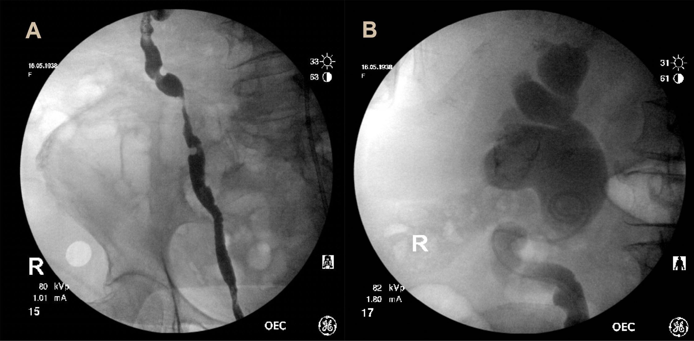 Figure 2. Right retrograde pyelogram revealing multifocal filling defects within the right ureter (A) and right sided hydronephrosis with ureteric stent in situ (B).
