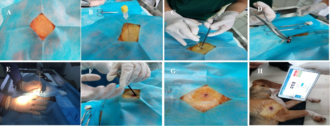 Figure 2. Operation steps: A. Shaving and disinfection at the surgical site; B. Puncture into the quadriceps femoris; C. Minimally invasive incision and skin expansion; D. A stimulator ready for implantation; E. Inoperative thresholding test; F. Stimulator implantation; G. Sutured wound; H. Postoperative functional assay.