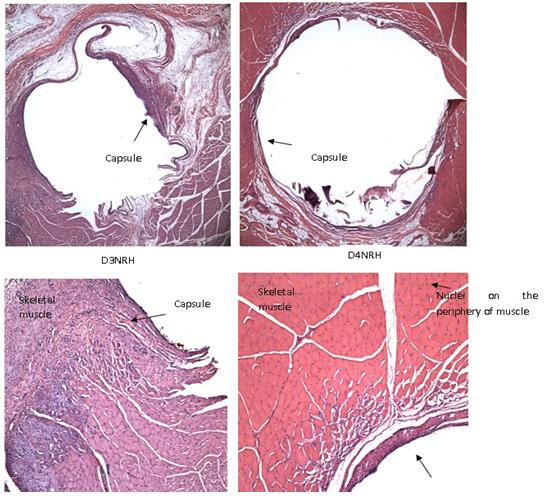 As shown in Figure 3, the implant was surrounded by a thin layer of connective tissue, with a mild cellular reaction. After implantation, the fibrous capsule at one month was found to be approximately twice as thick as that at 3 months. In the vicinity of the fibrous capsule, there was a small amount of muscular tissues with cells containing one central nucleus, indicating the tissues were recovering from the damage caused by initial implantation. The nuclei of distal myofibers were observed distributing around the muscle fibers, presenting a pattern of the healthy muscular fibers. After 3 months, intact muscles were close to the fibrous capsule, indicating that the injured muscles were being constantly repaired. Muscle fibers near the fibrous capsule tended to be transverse (parallel to the long axis of the cylindrical implant). Locally, the implant might have altered the orientation of some muscle fibers.