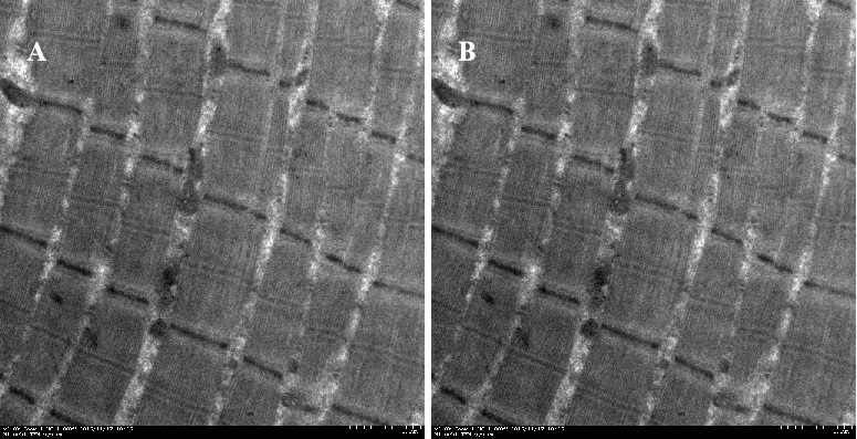 As shown in Figure 5, the normal muscle sarcomere was clearly demarcated and the muscle filaments were arranged neatly. No lysis or damage of muscle filaments were seen. Conspicuous Z lines and H lines could be seen. Mitochondria were of circular or oval shape, with high matrix electron density and clear mitochondrial crest (Fig. 5A). The muscle membrane was evenly