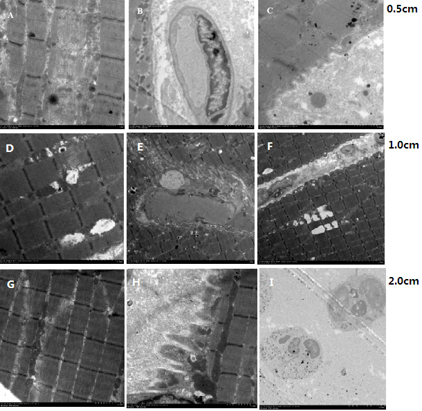 The muscle tissues 2.0 cm from the electrode (Fig. 6) had clear sarcomere boundaries, neat distribution of myofilaments, and showed no breakage of local myofilaments. Clear Z lines and H lines were noted (Fig. 6G). Some of the myocyte membranes bulged outward and showed a serrated pattern (Fig. 6H). A small number of inflammatory cells were seen between the muscle cells (Fig. 6I).