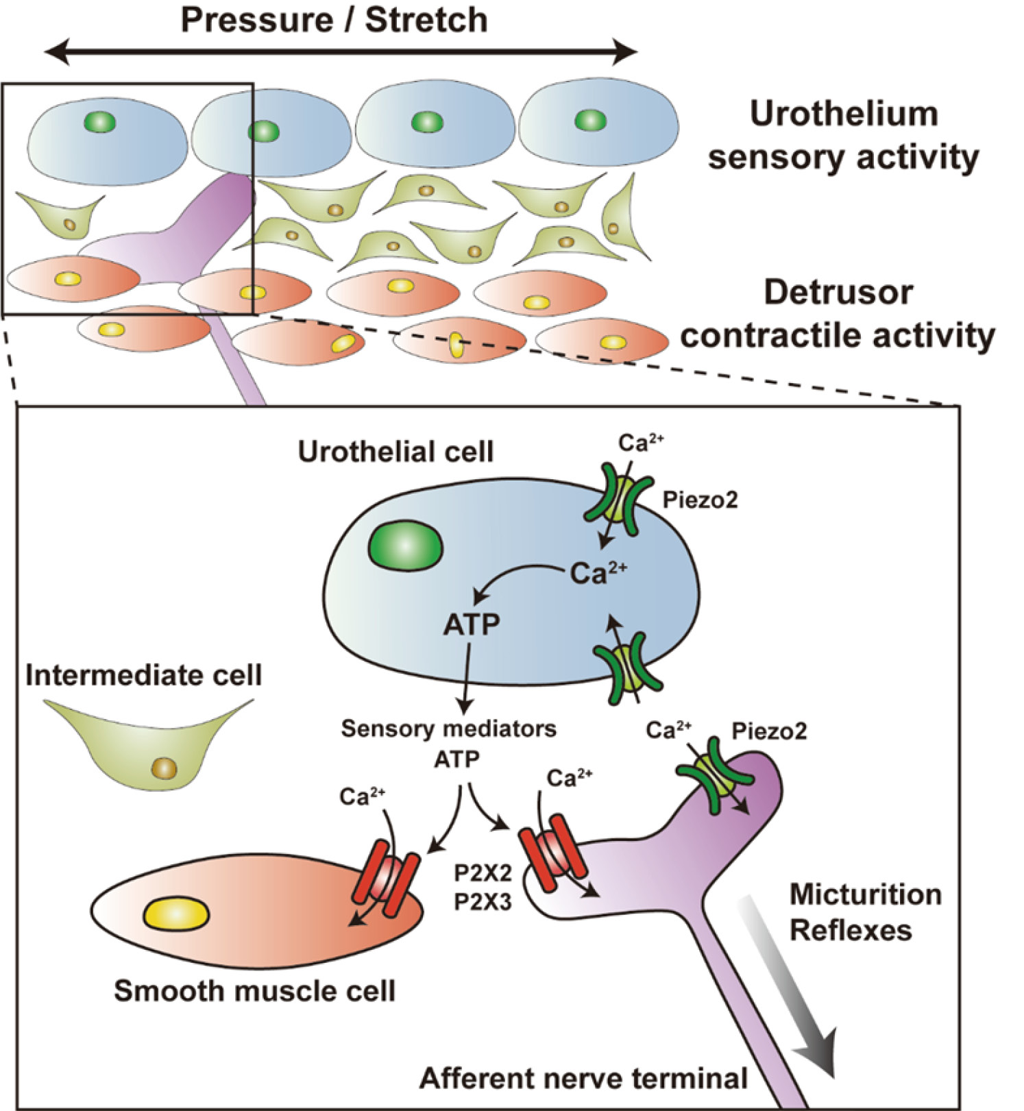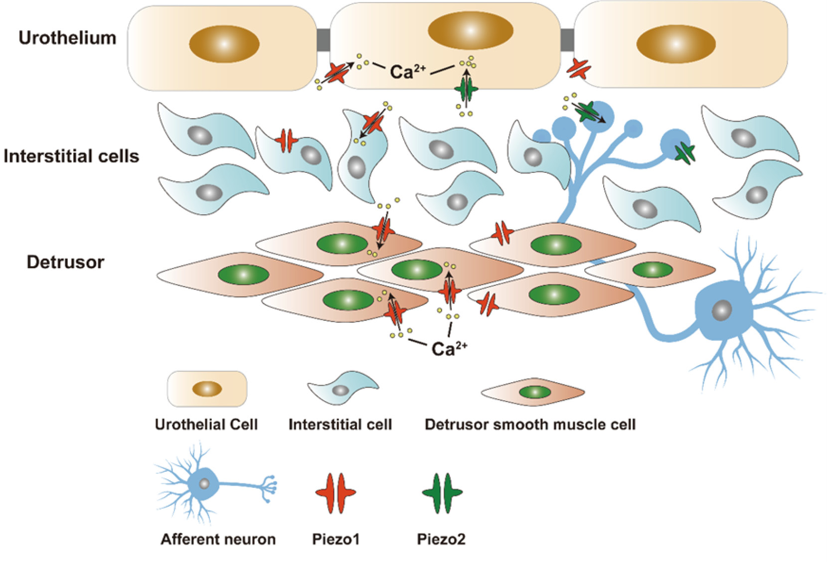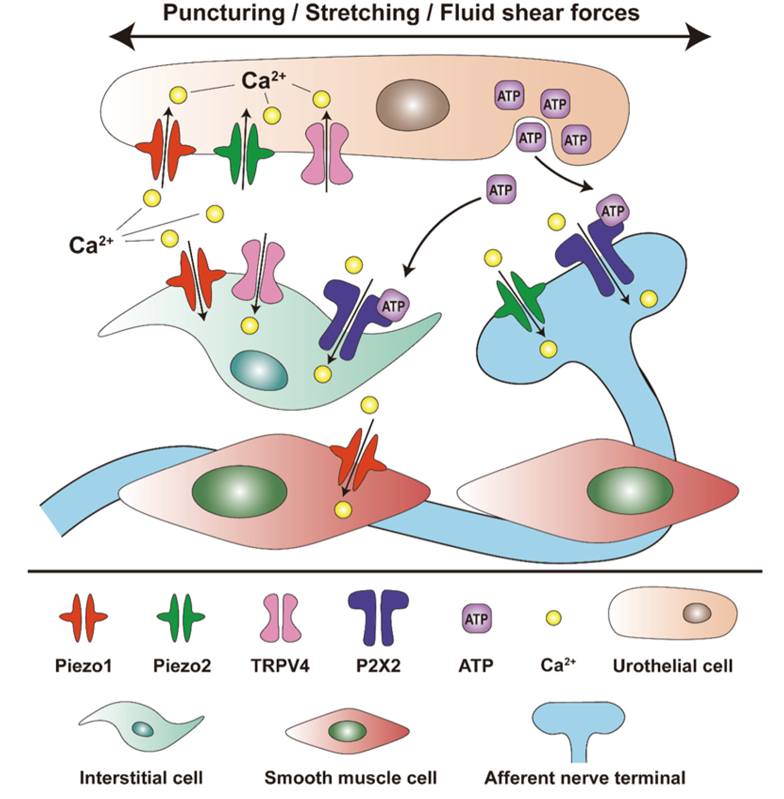 Abbreviation used: [Ca2+]i, Intracellular calcium concentration; ATP, Adenosine triphosphate; BOO, Bladder outlet obstruction; CYP-induced, Cyclophosphamide-induced; DCP, Diabetic cystopathy; DRG, Dorsal root ganglia; FISH, Fluorescence in situ hybridization; GsMTx4, Grammostola spatulate mechanotoxin 4; ICCs, Interstitial Cajal-like cells; ICs, Interstitial cells; KO, Knockout; LP, Lamina propria ; LP-ICs, Interstitial cells in bladder lamina propria; LUT, Lower urinary tract; LUTS, Lower urinary tract symptoms; NCX1, Na+/Ca2+ exchanger 1; OAB, Overactive bladder; pBOO, Partial bladder outlet obstruction; PIEZO1-tdT, PIEZO1 fused to the red fluorescent reporter tandem-dimer Tomato; SAC, Stretch-activated ion channel ; SACs, Stretch-activated ion channels; TRPV4, Transient receptor potential vanilloid 4; UCs, Urothelial cells