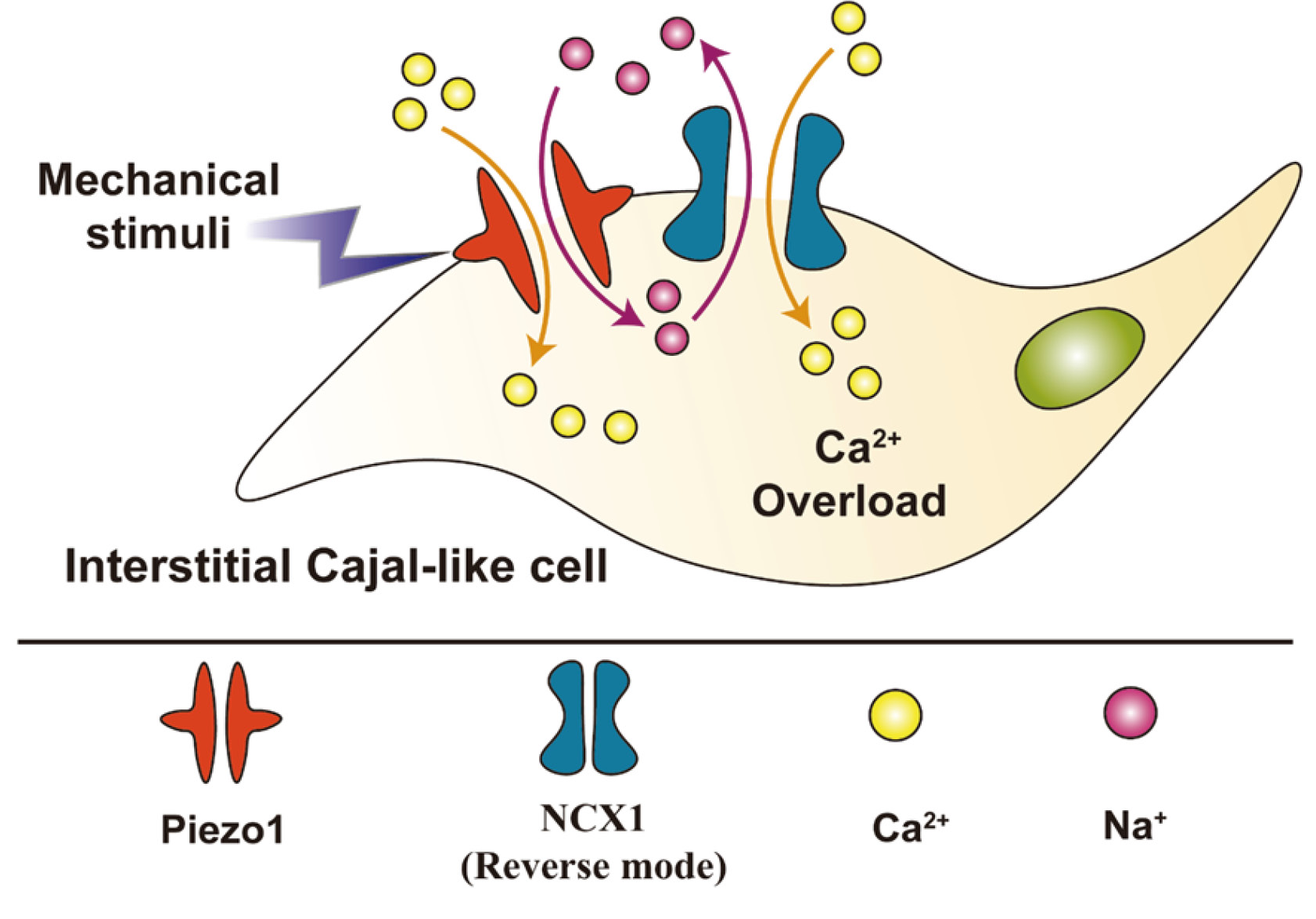 Figure 4 Piezo1 channel interacts with the reverse mode of NCX1 in ICCs. In chronic cystitis induced by cyclophosphamide, Piezo1 channel in interstitial Cajal-like cells (ICCs) of bladder can be activated by mechanical stimuli, which leads to the influx of Ca2+ and Na+. Simultaneously, through the reverse mode of Na+/Ca2+ exchanger 1 (NCX1), Na+ from cytoplasm is extracted in exchange for additional Ca2+ entering ICCs. The synergistic effects of the Piezo1 channel and NCX1 increased the intracellular concentration of Ca2+, which results in Ca2+ overload in bladder ICCs. This may be a potential mechanism underlying bladder hyperactivity related to chronic cystitis.