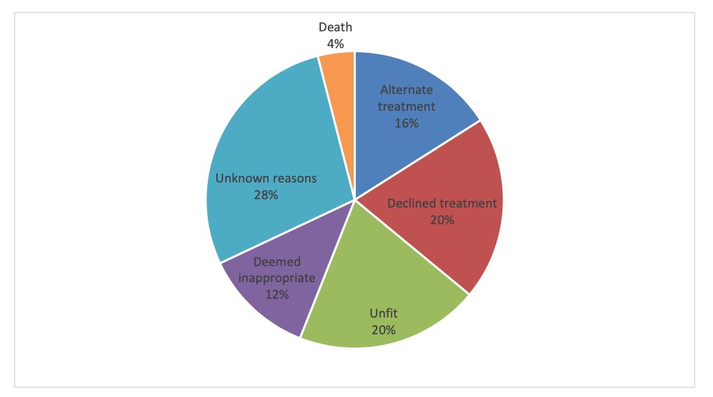 Of the 25 patients who did not receive AC, 28% did not have the rationale documented, 20% were deemed unfit or the patient had declined treatment (Fig. 1). Three (12%) patients were classified as inappropriate for AC; one due to delays post RC, another patient due to avoiding immunosuppression in this high-risk patient during the COVID-19 pandemic and the third due to a rare variant histology.
