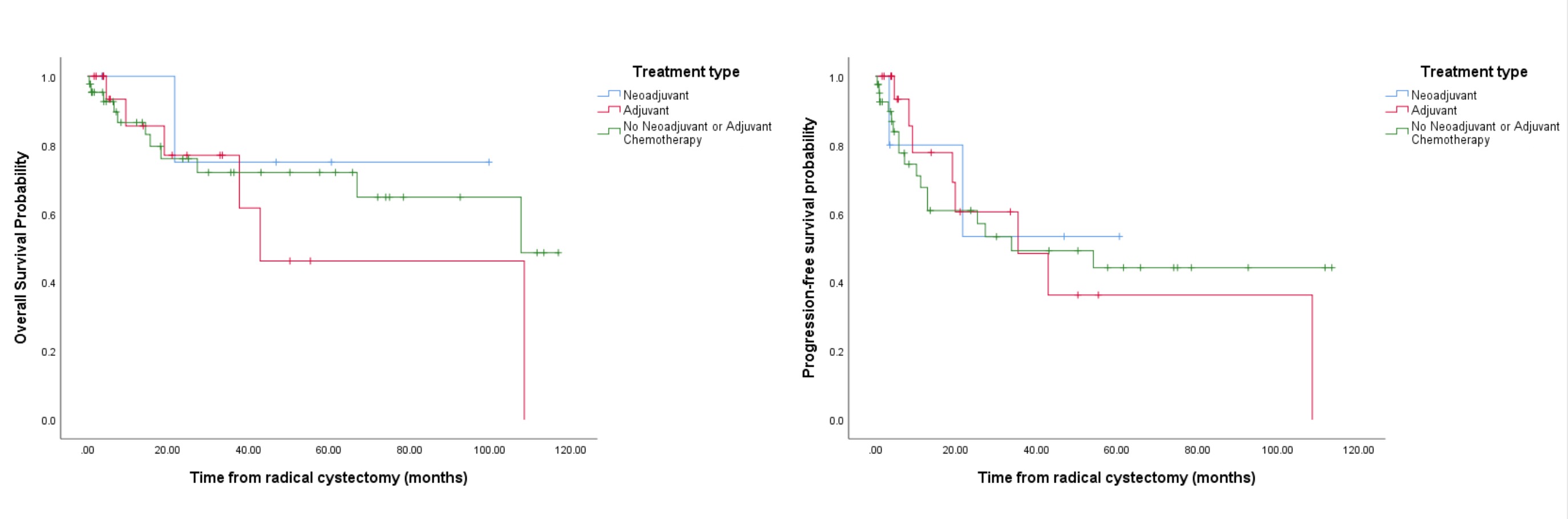 Results: Of 69 patients who had a cystectomy for ≥ pT2 bladder cancer, 73.9% were eligible for NAC. However, of those eligible, only five patients received NAC (9.8%). Of the total patients who were eligible for AC, only 44.4% received postoperative chemotherapy. Common reasons for the lack of uptake were due to patients being unfit or declining treatment. There was no difference in progression-free survival or overall survival in those who received NAC and AC.
