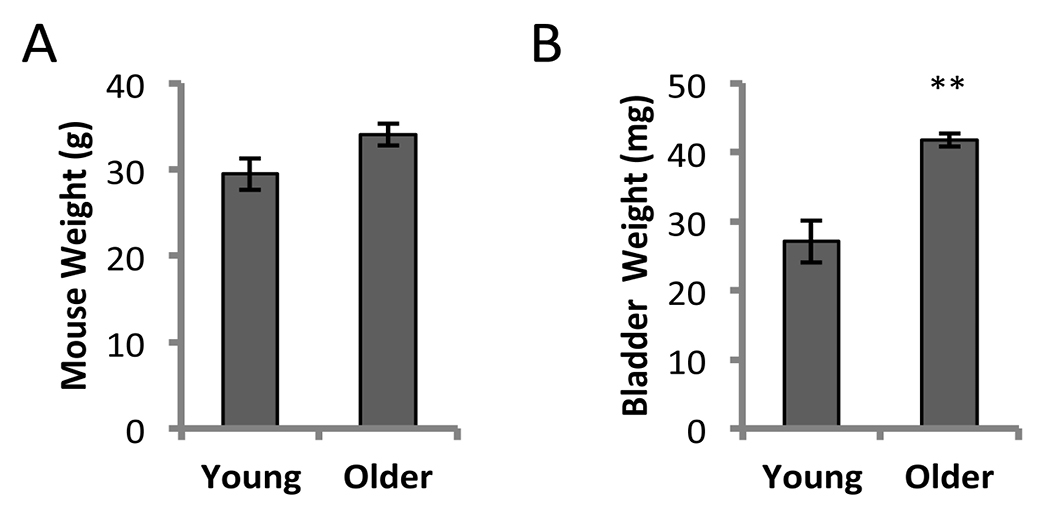 Figure 1. Mouse and bladder weights from 23 months old and 1314 months old C57BL/6J males. A. Mouse weights were not significantly different. The average weight of young males (n = 4) was 29.5 ± 1.8 g compared to 34.1 ± 1.3 g for older males (n = 4). B. Bladder wet weights. Older mice had significantly heavier bladders (41.7 ± 0.9 mg vs. 27.0 ± 3.0 mg; mean ± SEM; **P < 0.01).
