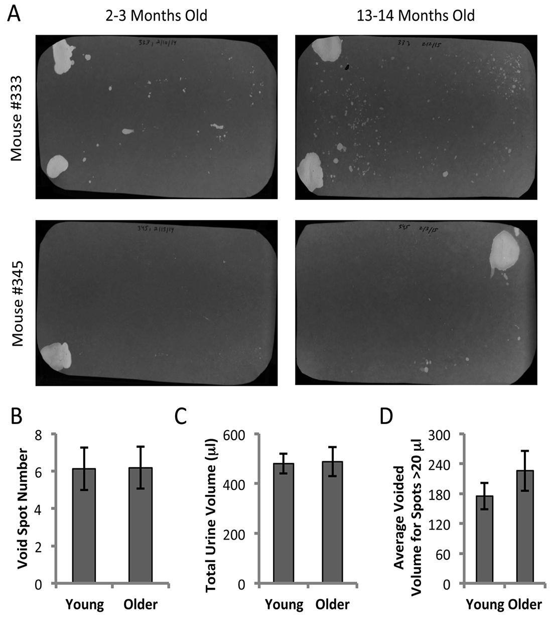 Figure 2. Void spot assays on five mice at 23 months and 1314 months of age. A. Representative filters from 2 individual mice at the younger and older ages. Mouse #333 exhibits greater small spot dispersion which may be related to marking behavior or fur contamination. B-D. Data are from 5 mice tested three times each at each age and averaged. All spots with an area corresponding to < 5 µl were eliminated from the analysis. B. Total number of spots > 5 µl; C. Total urine volumes; D. Average volume of voids larger than 20 µl. Data are mean ± SEM. Paired t-test showed no difference in any parameter with age.
