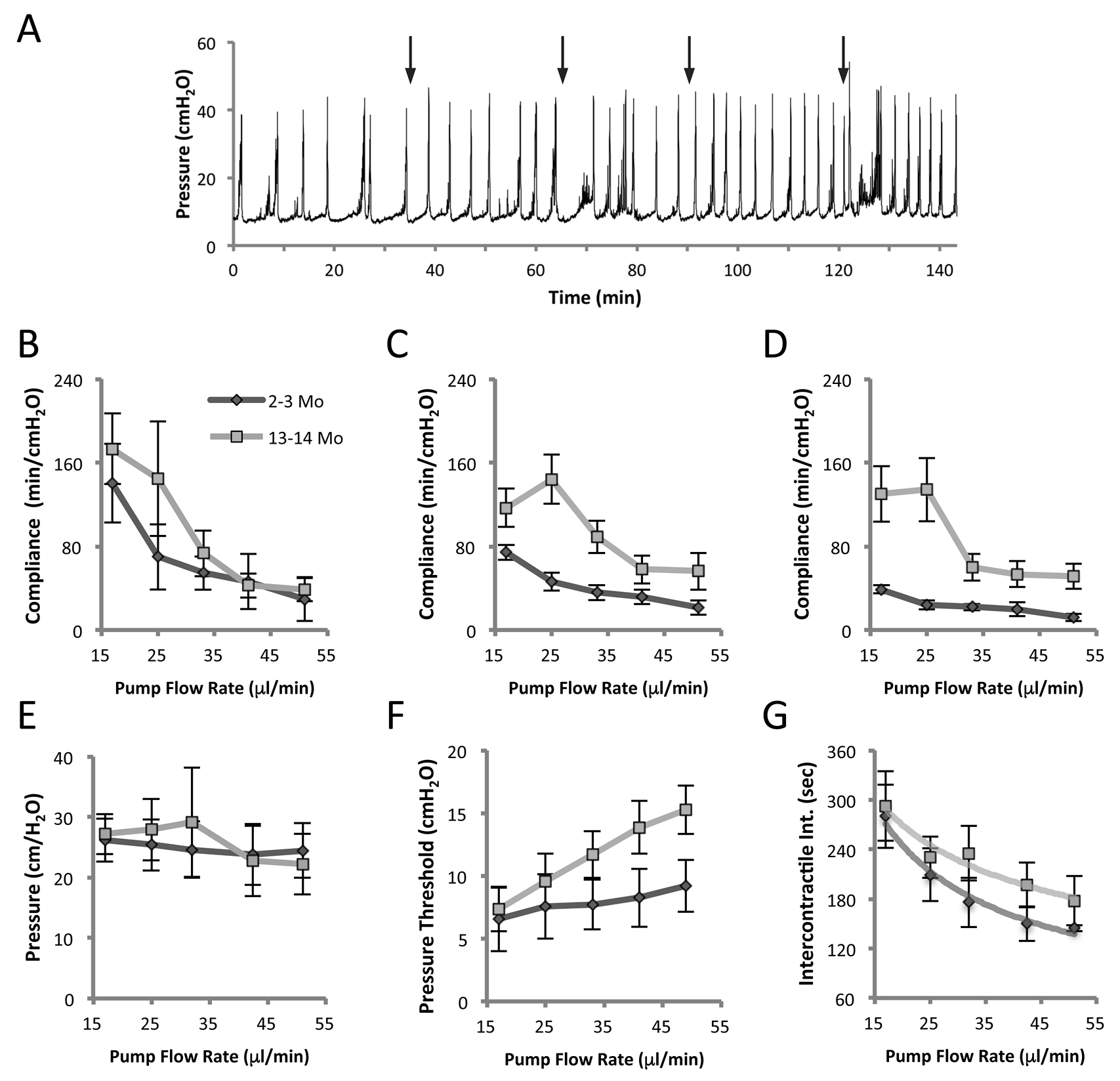 We performed anesthetized cystometry on eight mice and examined the effect of slowly increasing the pump speed, and therefore the bladder filling rate, on several parameters. Filling rates of 17, 25, 33, 41 and 49 µl/min were used. An example of the raw data for a 4-month-old mouse can be seen in Figure 3A with the times at which filling rate was increased indicated by arrows. It can be seen that with higher fill rates the voiding interval diminishes. An approximately 3-fold increase in pump speed from 17 µl/min to 49 µl/min, resulted in several measurable changes to cystometric parameters. Of these parameters however, peak voiding pressures did not change at any filling rate and were not different between younger and older mice (Fig. 3E). Therefore, older age did not influence the maximal voiding pressures and increasing the flow-rate did not cause compensatory changes in expulsive pressure.