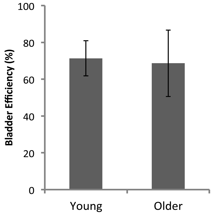 Heavier bladders did not equate to functionally larger bladders. VSA showed there were similar total volumes of urine voided by both the younger and older groups and similar per-void volumes. This conclusion is further supported by the similar ICI’s at each flow rate (Fig. 3G) and the similar bladder efficiencies (Fig. 4). A steady increase in bladder weight with age has been noted by others [8,9]. Extensive remodeling particularly in old age is associated with disorganization of the urothelium, increased collagen density and thickness within the lamina propria and collagen infiltration into the muscle bundles [10]. Despite the fact that bladders became significantly heavier with age, the expulsive pressure was maintained — at all filling rates (Fig. 3E). This is consistent with the findings of Smith et al. [8] who observed that even very aged mice (up to 26 months) showed no loss of detrusor strength. However, sensitivity to filling was reduced, consistent with altered neural processing [8]. Our pressure threshold data (Fig. 3F) would suggest some loss of sensitivity to filling also. Further, we can add to their observations by noting that the rate of filling does not affect contractile pressures.